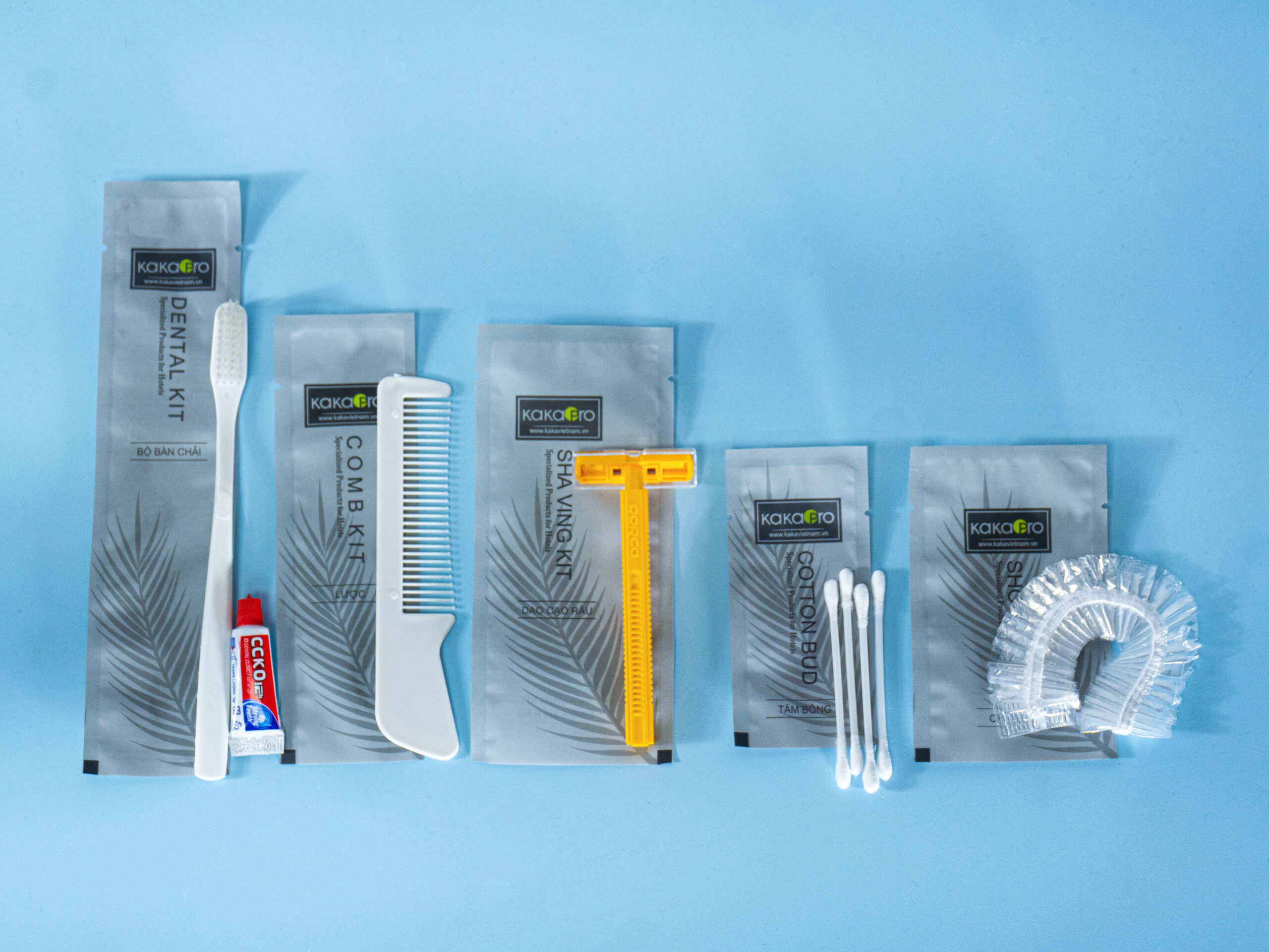Giá trị cốt lõi của bộ amenities khách sạn mã 01 nằm ở sự đồng bộ và chuyên nghiệp. Từ bàn chải đánh răng, lược chải đầu đến dao cạo râu, tăm bông... tất cả đều được đóng gói kỹ lưỡng trong bao bì nilon mờ (Matte foil bag) cao cấp, giúp bảo quản sản phẩm khỏi độ ẩm và bụi bẩn, đồng thời tạo điểm nhấn thẩm mỹ hiện đại.