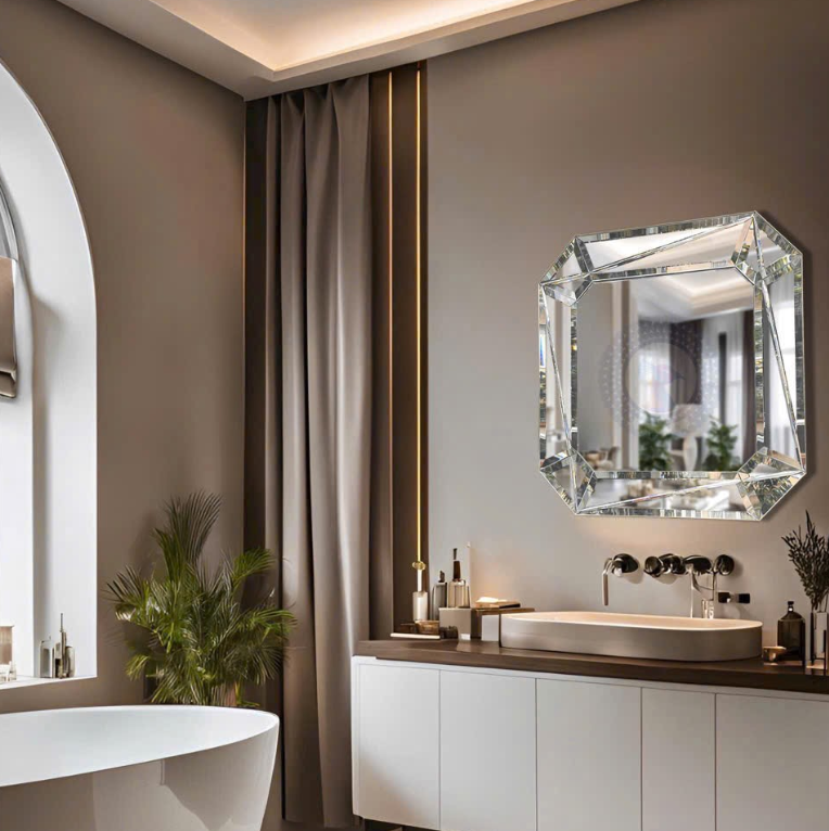 Gương phòng tắm khách sạn là loại gương được lắp đặt phía trên bồn rửa mặt, yêu cầu bắt buộc phải sử dụng phôi gương Bỉ tráng bạc 8 lớp để chống lại độ ẩm cao và hơi nước nóng lạnh liên tục. Đây là khu vực tiếp xúc trực tiếp với nước, nên chất lượng phôi gương quyết định việc bề mặt có bị ố mốc hay nổ xi sau thời gian ngắn sử dụng hay không.