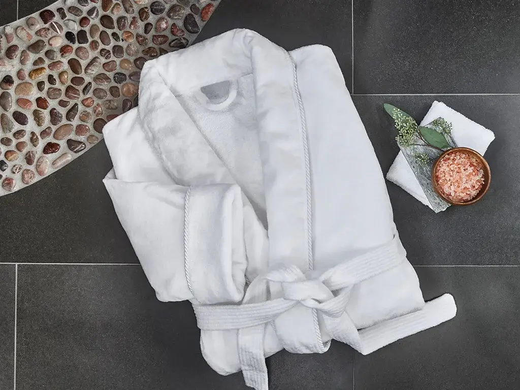 Khăn choàng tắm (hay còn gọi là áo choàng tắm) là loại trang phục chuyên dụng trong khách sạn, được thiết kế dạng áo khoác dài có đai thắt ngang eo, dùng để khoác lên người sau khi tắm, bơi lội hoặc thư giãn tại spa để giữ ấm và thấm hút nước. Đây là một trong những món đồ dùng khách sạn thiết yếu, không chỉ phục vụ nhu cầu vệ sinh cá nhân mà còn nâng tầm trải nghiệm nghỉ dưỡng của khách hàng.