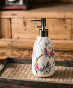 Bình đựng dầu gội sữa tắm khách sạn cao cấp Mã BSTDB 18 (Model W022) là giải pháp amenities 5 sao, mang đậm phong cách Vintage (Cổ điển) và thanh lịch. Sản phẩm gây ấn tượng thị giác mạnh mẽ với thân gốm sứ men rạn (cracked glaze) màu trắng kem, được trang trí bằng họa tiết decal hấp nhiệt tinh xảo và vòi bơm mạ đồng giả cổ (Antique Bronze) độc đáo.