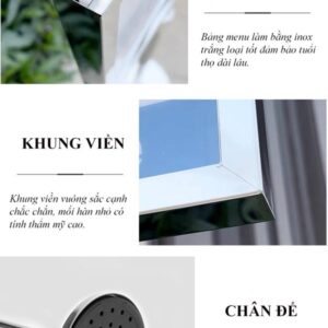 Được chế tác từ Inox (thép không gỉ) cao cấp, đây là một bảng menu inox đảm bảo độ bền vượt trội, chống gỉ sét tuyệt đối (kể cả khu vực ven biển) và kết cấu vững chãi (nhờ đế nặng Ø32-35cm). Đây là lựa chọn đầu tư thông minh cho mọi bảng menu nhà hàng hoặc khách sạn.