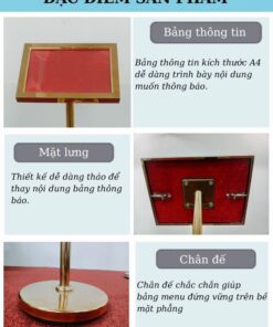 Được chế tác từ chất liệu Inox (thép không gỉ) cao cấp, sản phẩm đảm bảo độ bền vượt trội, khả năng chống gỉ sét tuyệt đối (kể cả khu vực ven biển) và kết cấu vững chãi (nhờ chân đế nặng). Đây là một bảng welcome inox lý tưởng, khẳng định sự chuyên nghiệp và tinh tế trong dịch vụ.