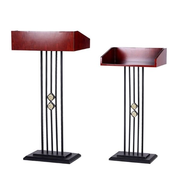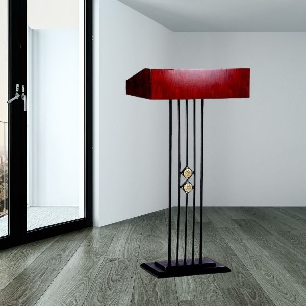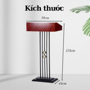 Chiều cao tiêu chuẩn 118 cm được tính toán kỹ lưỡng, đảm bảo tầm nhìn tốt nhất cho người đứng phát biểu, đồng thời tạo cảm giác trang nghiêm, tự tin. Màu đỏ đun nổi bật của phần thân gỗ kết hợp với khung thép đen tạo nên sự tương phản sắc nét, thu hút mọi ánh nhìn vào khu vực sân khấu chính.