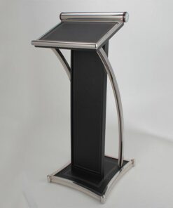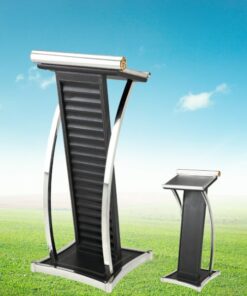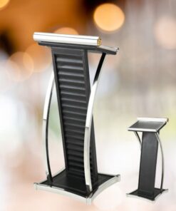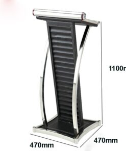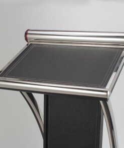 Bục có chiều cao chuẩn mực 110 cm, cùng kích thước mặt bục vừa phải (47 x 47 cm), mang lại sự thoải mái tối đa khi đặt tài liệu và tương tác. Sự kết hợp màu đen và inox trắng tạo nên sự tương phản cổ điển, thể hiện gu thẩm mỹ tinh tế và trang trọng.