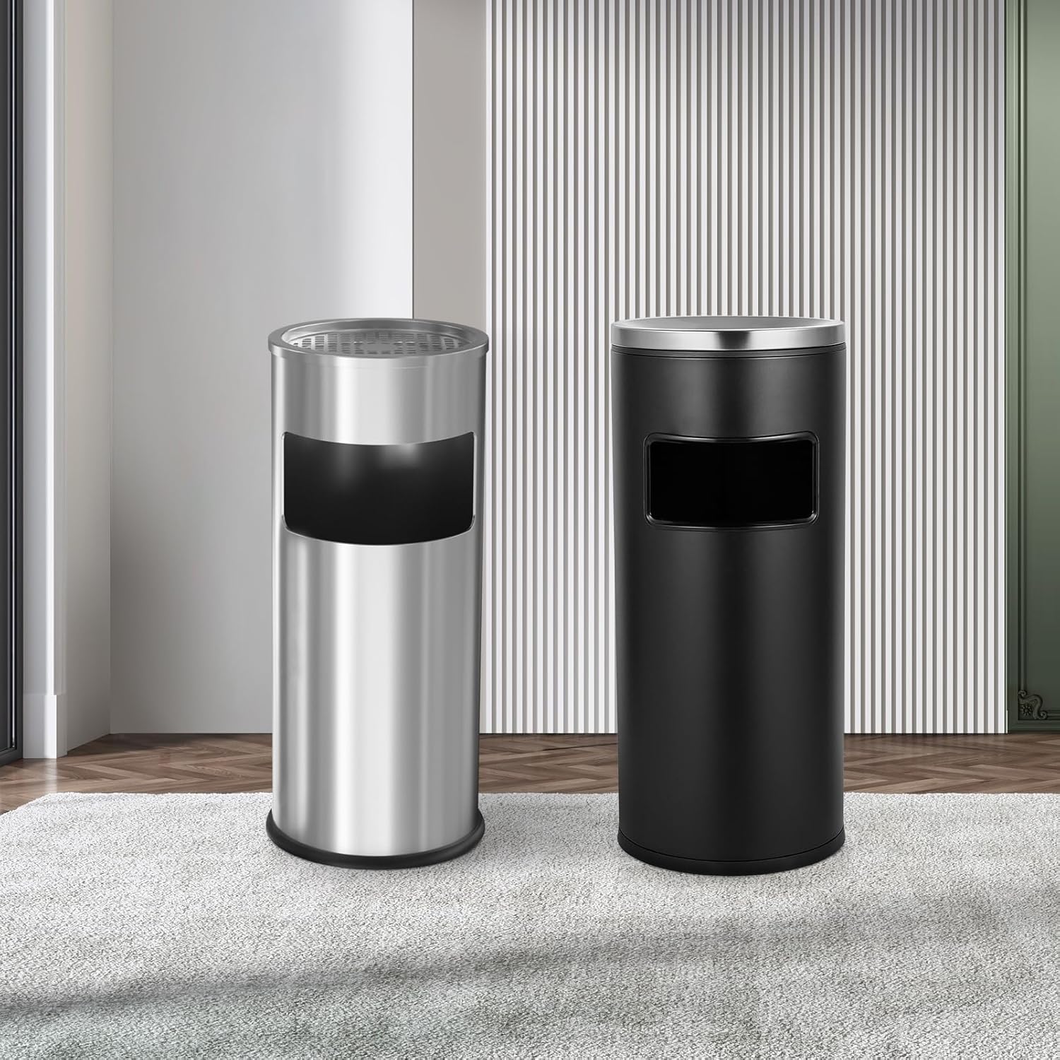 Chất liệu phổ biến của loại thùng rác này là inox 304, inox mạ vàng, hoặc thùng rác đá hoa cương khách sạn. Thiết kế này vừa giúp thu gom rác thải, vừa cung cấp chỗ gạt tàn thuốc lịch sự, ngăn ngừa tàn thuốc vương vãi gây mất vệ sinh và nguy cơ cháy nổ.