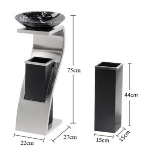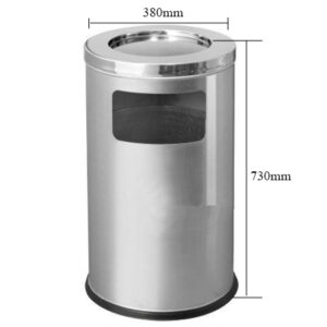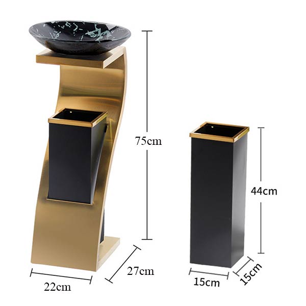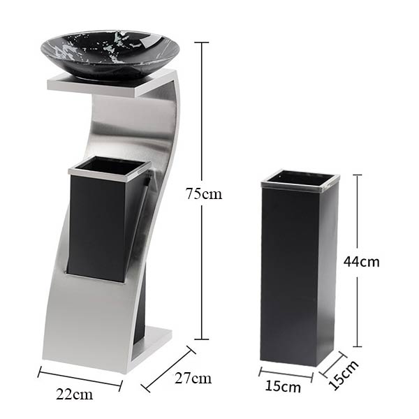 Đây là một thùng rác gạt tàn inox đa năng. Mặt trên được trang bị khay gạt tàn bằng thủy tinh (thường là màu đen), chịu nhiệt tốt, không bị ố vàng do tàn thuốc và cực kỳ dễ dàng tháo rời để vệ sinh. Cửa xả rác bên hông được thiết kế kín đáo, giúp che giấu rác thải bên trong một cách tinh tế.