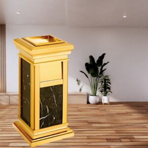 Thùng rác inox mạ vàng đá đen có gạt tàn mã HTG-17B-B2 là giải pháp vệ sinh cao cấp, được xem là biểu tượng cho sự sang trọng và đẳng cấp tại các không gian tiền sảnh 5 sao. Sản phẩm là sự kết hợp vật liệu đỉnh cao giữa khung Inox mạ vàng PVD lộng lẫy và thân ốp đá hoa cương (đá đen) huyền bí, vững chãi.