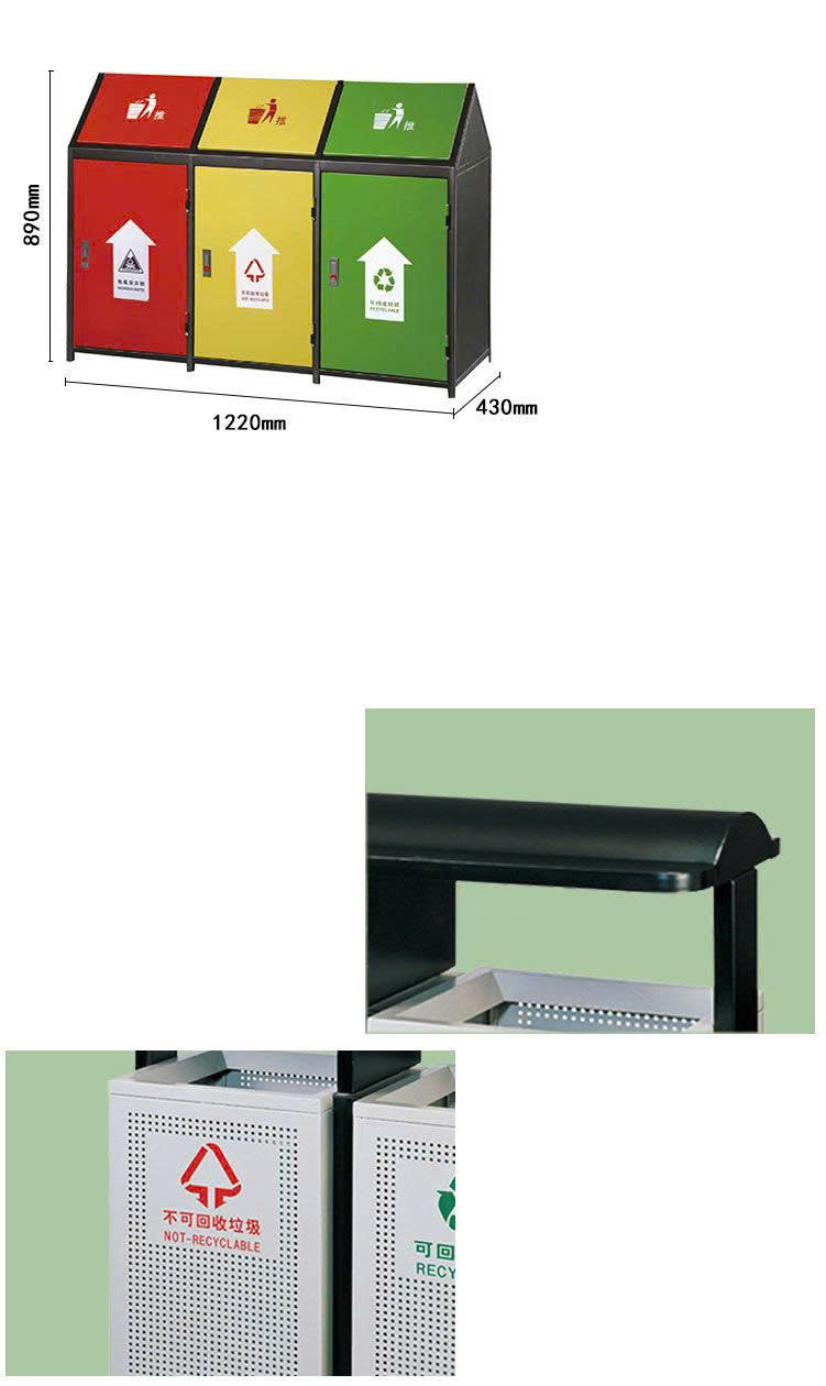 Điểm nhấn của sản phẩm là phần thân thùng được gia công tinh xảo. Một số phiên bản sử dụng tấm thép dập lỗ (perforated steel) tạo hiệu ứng thị giác thoáng mắt và giảm sức cản của gió. Các cửa xả rác được bố trí ở độ cao vừa tầm tay, có in logo và màu sắc hướng dẫn phân loại rác rõ ràng (Biểu tượng Tái chế màu Xanh/Vàng, Rác thải khác màu Đỏ/Ghi), giúp người dùng dễ dàng nhận biết.