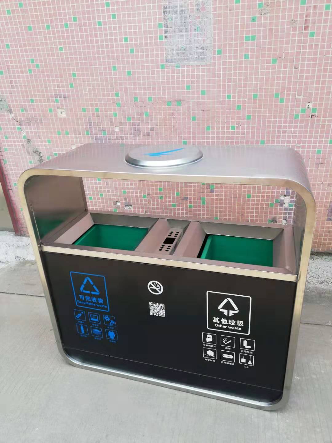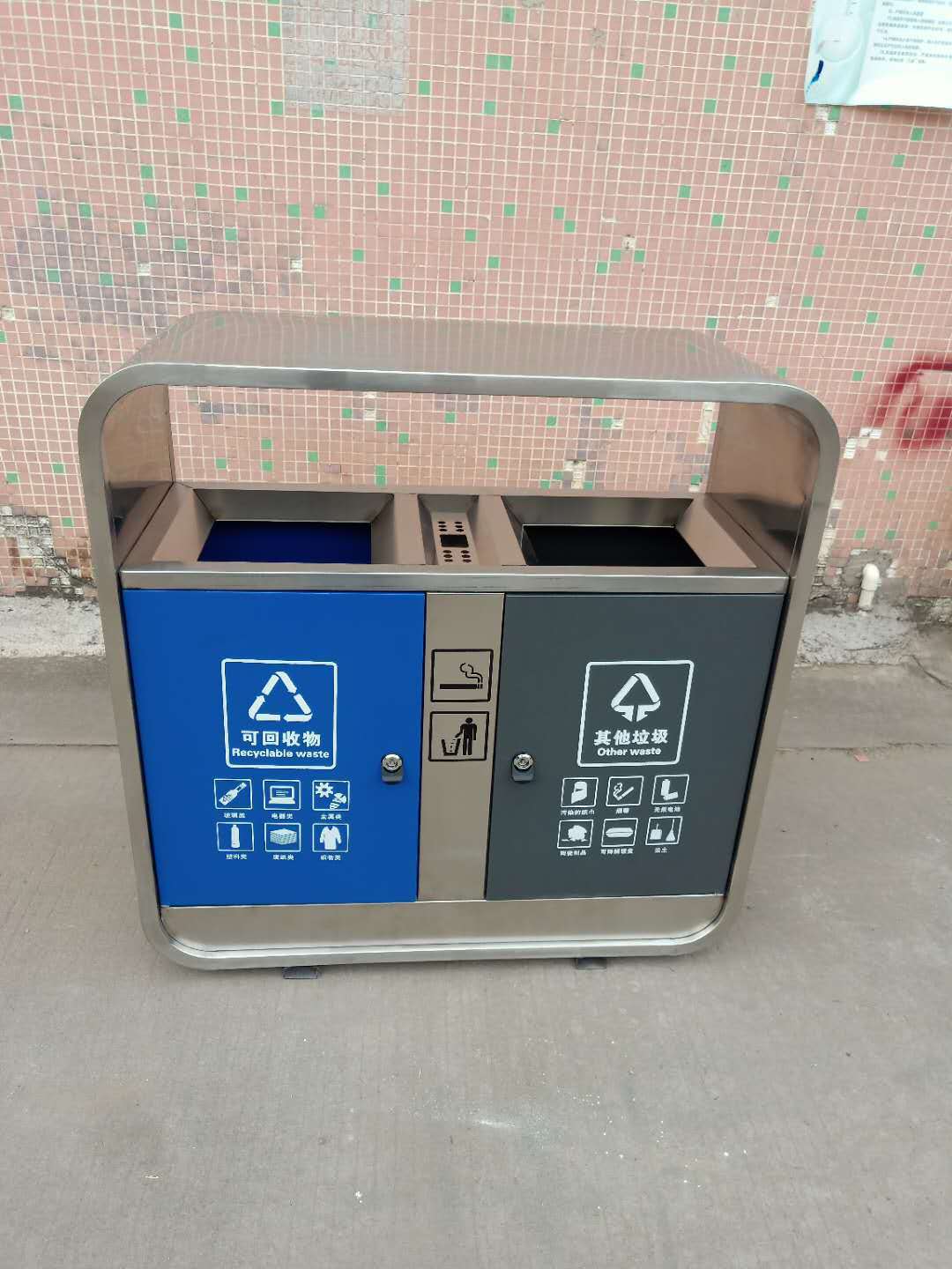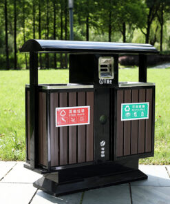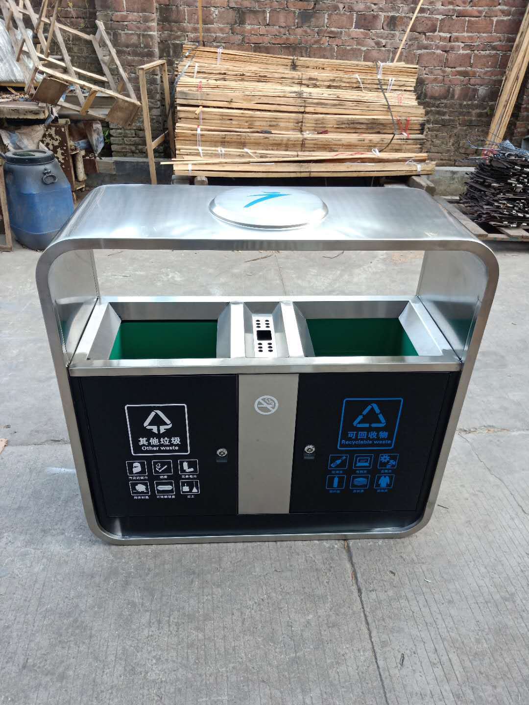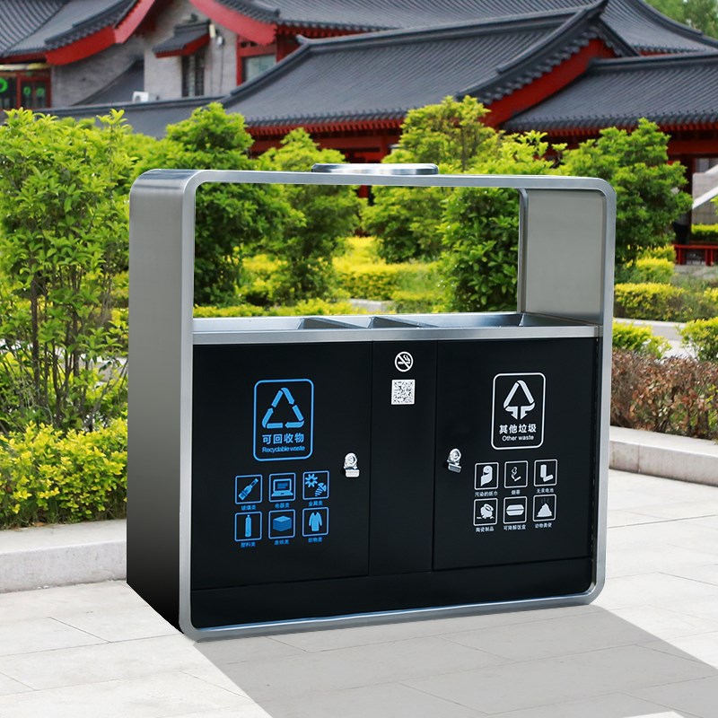 Điểm nhấn của sản phẩm là hệ thống cửa xả rác riêng biệt cho từng ngăn, được dán decal hướng dẫn phân loại rõ ràng (ví dụ: Biểu tượng tái chế màu xanh, rác khác màu trắng). Điều này giúp người sử dụng dễ dàng nhận biết và bỏ rác đúng nơi quy định. Đặc biệt, ở phiên bản thùng rác ngoài trời hai ngăn, phần trung tâm được tích hợp khay gạt tàn thuốc lá và khe bỏ pin hỏng, thể hiện sự tinh tế trong việc bảo vệ môi trường.