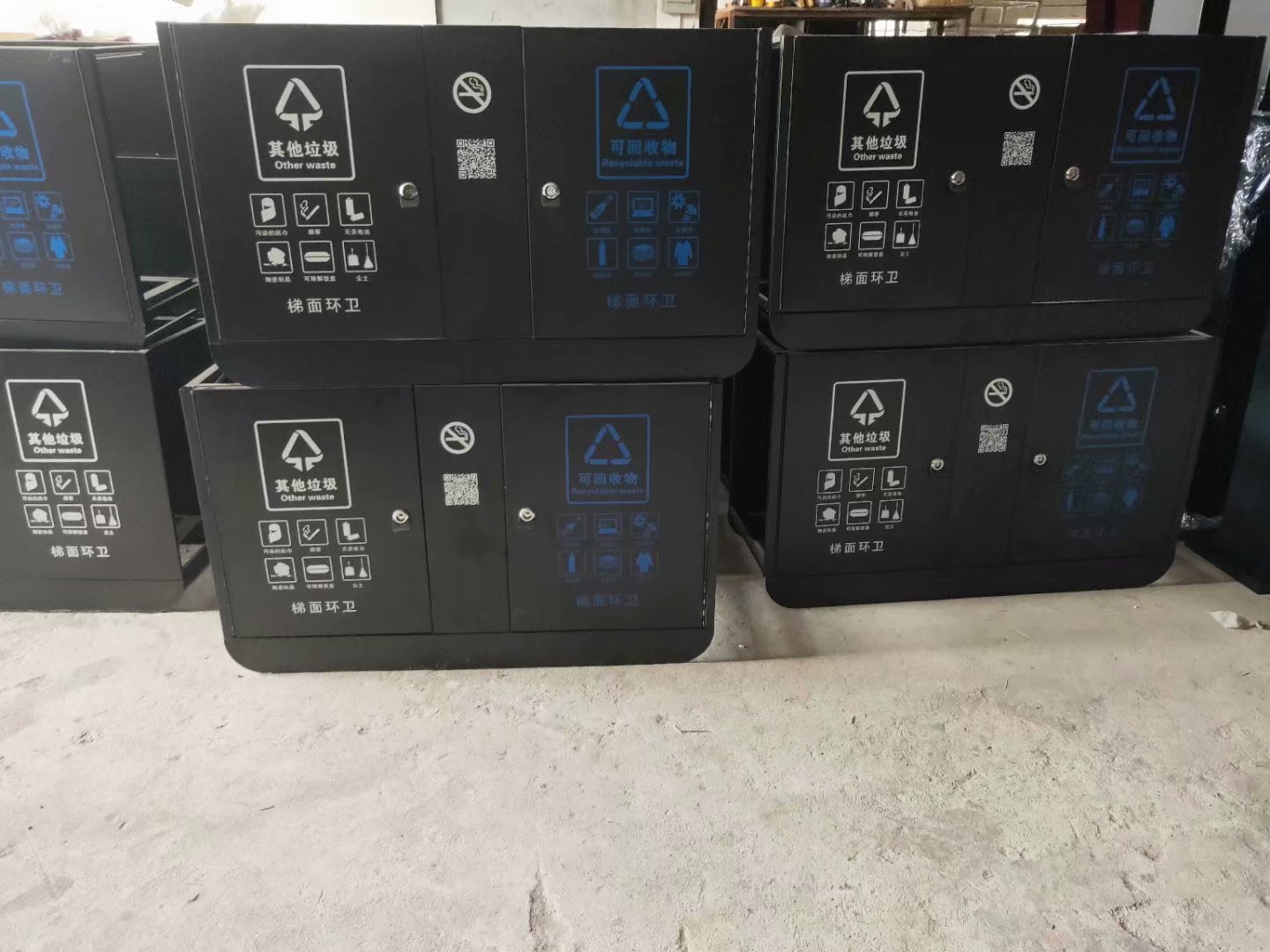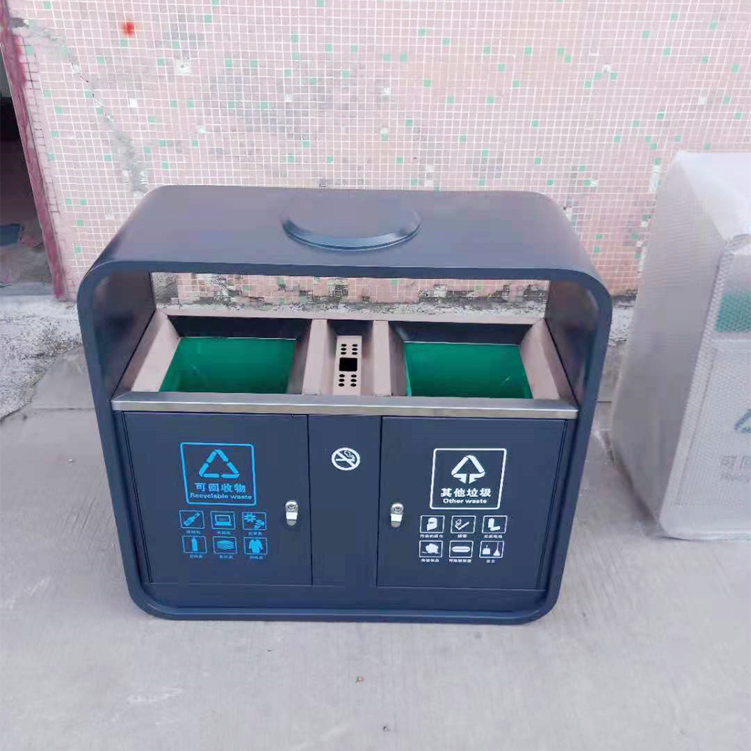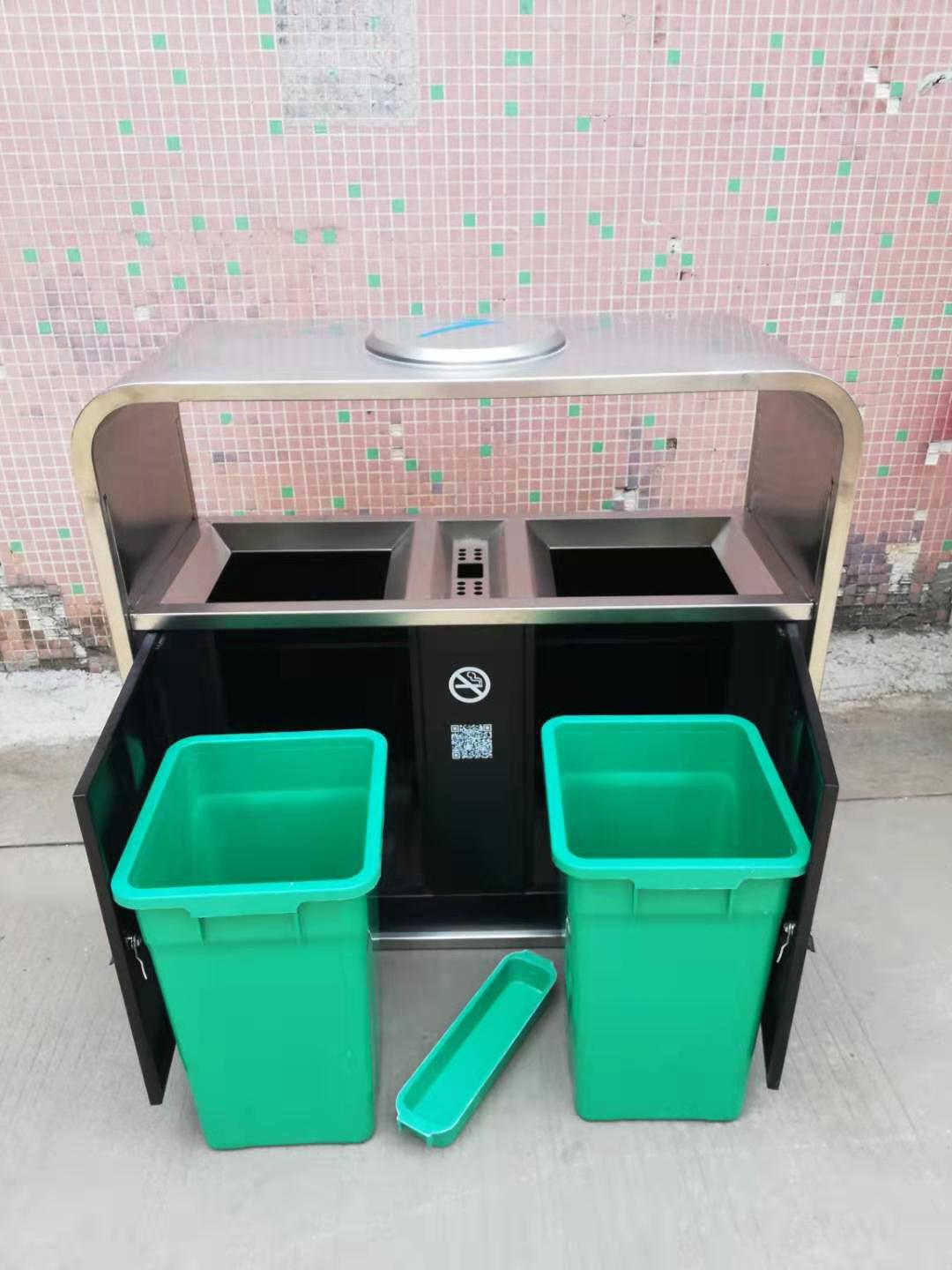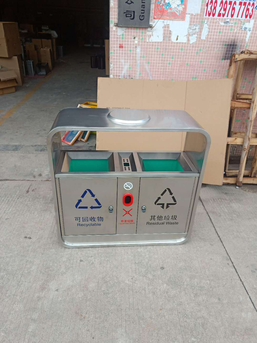 Điểm nhấn của sản phẩm là hệ thống cửa xả rác riêng biệt cho từng ngăn, được dán decal hướng dẫn phân loại rõ ràng (ví dụ: Biểu tượng tái chế màu xanh, rác khác màu trắng). Điều này giúp người sử dụng dễ dàng nhận biết và bỏ rác đúng nơi quy định. Đặc biệt, ở phiên bản thùng rác ngoài trời hai ngăn, phần trung tâm được tích hợp khay gạt tàn thuốc lá và khe bỏ pin hỏng, thể hiện sự tinh tế trong việc bảo vệ môi trường.