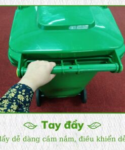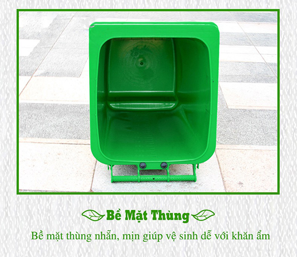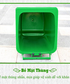 Sản phẩm có thiết kế hình trụ đứng chắc chắn, miệng thùng rộng (40x40cm) được gia cố thêm các gân tăng cứng, giúp thùng không bị biến dạng khi nâng hạ bằng xe cẩu rác chuyên dụng. Nắp thùng đậy kín, có tay cầm thuận tiện, giúp ngăn chặn mùi hôi phát tán và ngăn nước mưa xâm nhập, đảm bảo vệ sinh tối đa cho khu vực tập kết.
