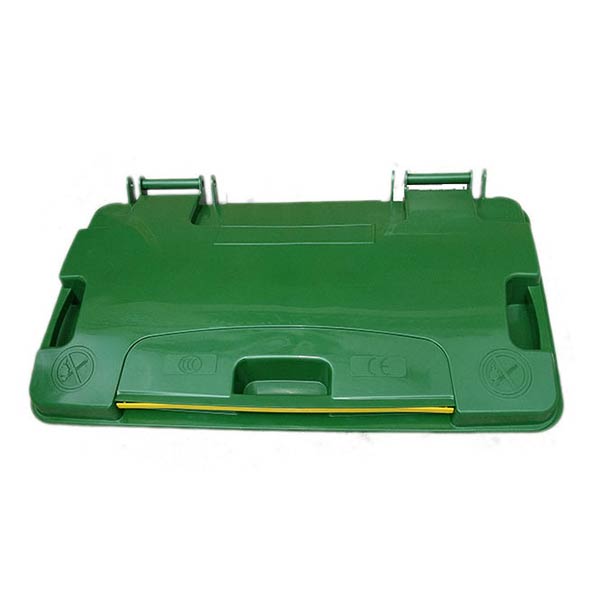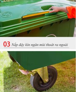 Thân thùng được gia cố bằng các đường gân chịu lực chạy dọc và quanh miệng thùng, giúp sản phẩm giữ nguyên phom dáng, không bị móp méo khi nâng hạ bằng hệ thống càng gắp của xe rác. Nắp thùng đậy kín, có tay cầm thuận tiện, giúp ngăn chặn mùi hôi nồng nặc và ngăn nước mưa xâm nhập, đảm bảo vệ sinh cho khu vực tập kết.
