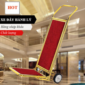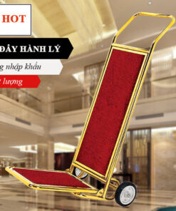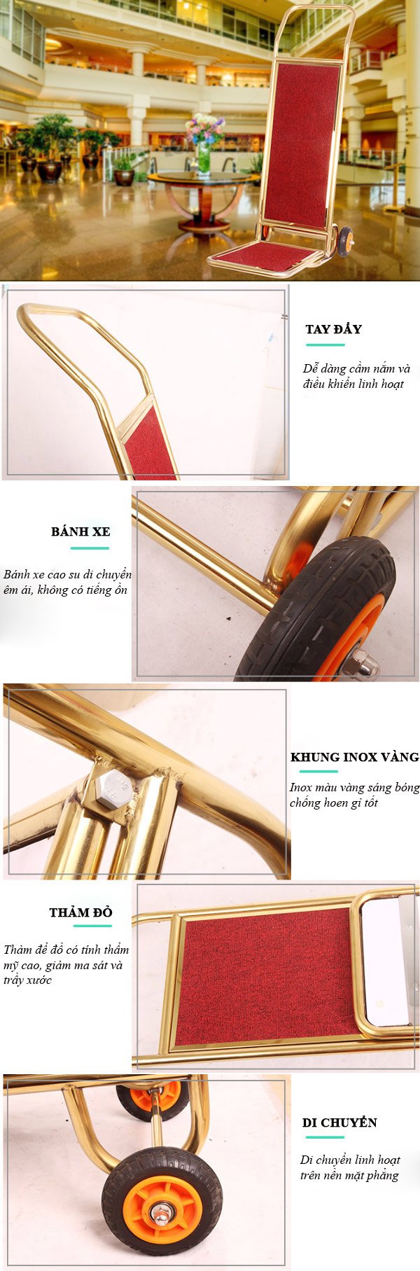 Dù nhỏ gọn, sàn xe vẫn được bọc thảm nỉ dày dặn (thường là đỏ/đen) để chống trầy xước vali hàng hiệu của khách. Hệ thống bánh xe cao su (thường là 2 bánh lớn hoặc 4 bánh nhỏ) di chuyển êm ái, không gây tiếng ồn và bảo vệ sàn nhà tuyệt đối.