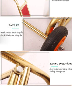 Toàn bộ khung xe được làm từ Inox (thép không gỉ) cao cấp, đảm bảo kết cấu cứng cáp, chịu tải trọng tốt cho 1-2 vali. Chất liệu Inox chống ăn mòn và gỉ sét tuyệt đối, ngay cả khi vận hành tại các resort ven biển.
