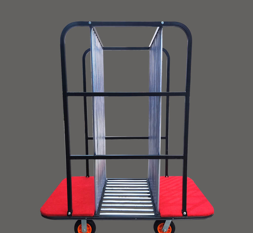 - Vận chuyển bằng xe đẩy: Chỉ cần 1 nhân viên đã có thể vận chuyển an toàn 10, 15, hoặc thậm chí 20 tấm mâm kính cùng một lúc. Tốc độ setup được đẩy nhanh gấp nhiều lần, giải phóng nhân lực để thực hiện các công việc khác.