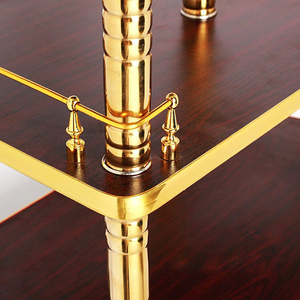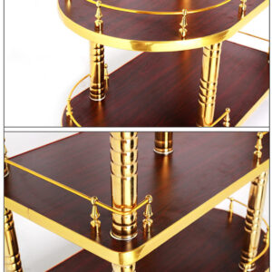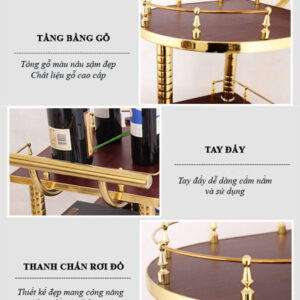• Chất liệu chính: Inox mạ vàng (Khung) + Gỗ (Mặt tầng)