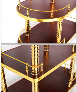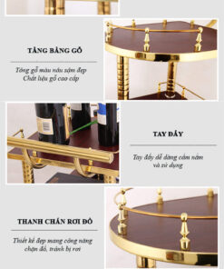 - Chất liệu chính: Inox mạ vàng (Khung) + Gỗ (Mặt tầng)