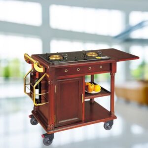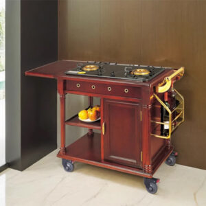Giá trị cốt lõi của xe phục vụ bàn bếp di dộng HTGX83-B là khả năng tích hợp 01 bếp ga đơn ngay trên mặt xe. Đây là một xe đẩy thức ăn nhà hàng chuyên dụng, cho phép đầu bếp thực hiện dịch vụ “tableside” (trình diễn chế biến tại bàn) các món flambé (đốt rượu), súp, hoặc tráng miệng, tạo ra trải nghiệm ẩm thực độc đáo, ấn tượng.