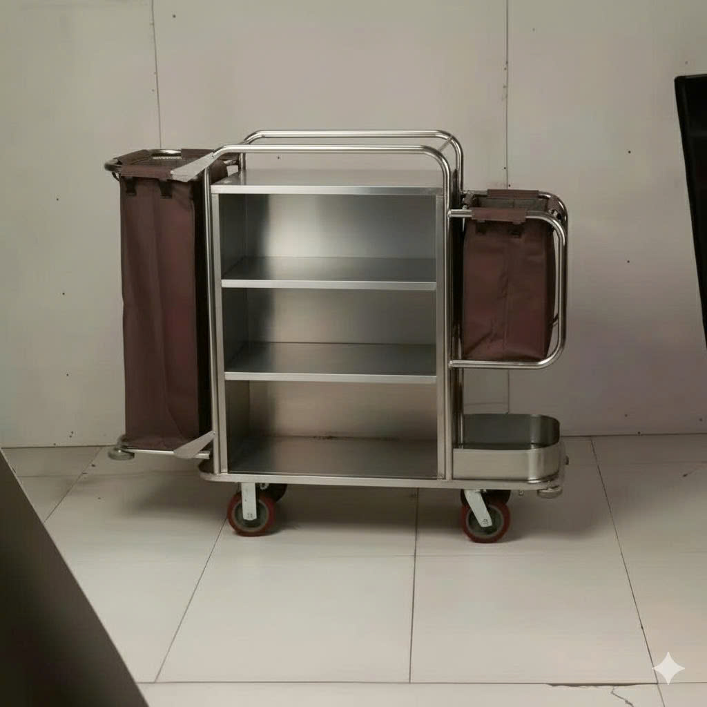 Xe dọn phòng khách sạn cao cấp mã 02 là giải pháp tối ưu cho công tác vệ sinh buồng phòng, được thiết kế để vận hành bền bỉ trong môi trường có độ ẩm cao và tần suất sử dụng liên tục. Sản phẩm mang vẻ đẹp hiện đại, sạch sẽ nhờ chất liệu Inox sáng bóng, tạo cảm giác chuyên nghiệp và tin cậy cho khách lưu trú.