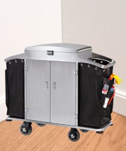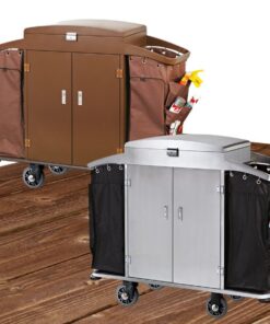 Với chiều dài 146.5cm, đây là một xe đẩy làm phòng khách sạn cỡ lớn. Hai túi vải bạt (thường là vinyl/canvas) chống thấm nước hai bên cho phép phân loại đồ bẩn (rác và khăn). Công suất lớn giúp giảm số lần quay về kho, tiết kiệm thời gian và tăng hiệu suất làm việc của nhân viên buồng phòng.