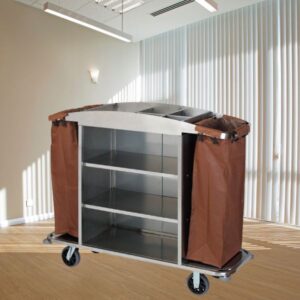 Với chiều dài 136cm, đây là một xe đẩy làm phòng khách sạn cỡ lớn. Thiết kế 3 tầng kệ kín đáo (hoặc hở, tùy phiên bản) giúp bảo quản đồ sạch (khăn, ga) ngăn nắp. Khay trên cùng (top tray) rộng rãi để sắp xếp amenities. Kích thước lớn giúp giảm số lần quay về kho, tiết kiệm thời gian và tăng hiệu suất làm việc.
