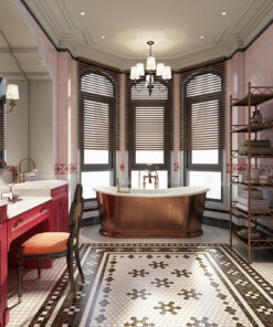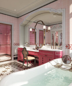Bên cạnh đó, phòng tắm tiếp tục là không gian nhấn mạnh sự xa hoa, sử dụng đá cẩm thạch (hoặc giả đá) có vân lớn ốp tường/sàn. Gương treo tường viền kim loại Vàng/Đồng và hệ thống chiếu sáng hắt sáng cẩn thận, biến phòng tắm thành một không gian trải nghiệm đẳng cấp.
