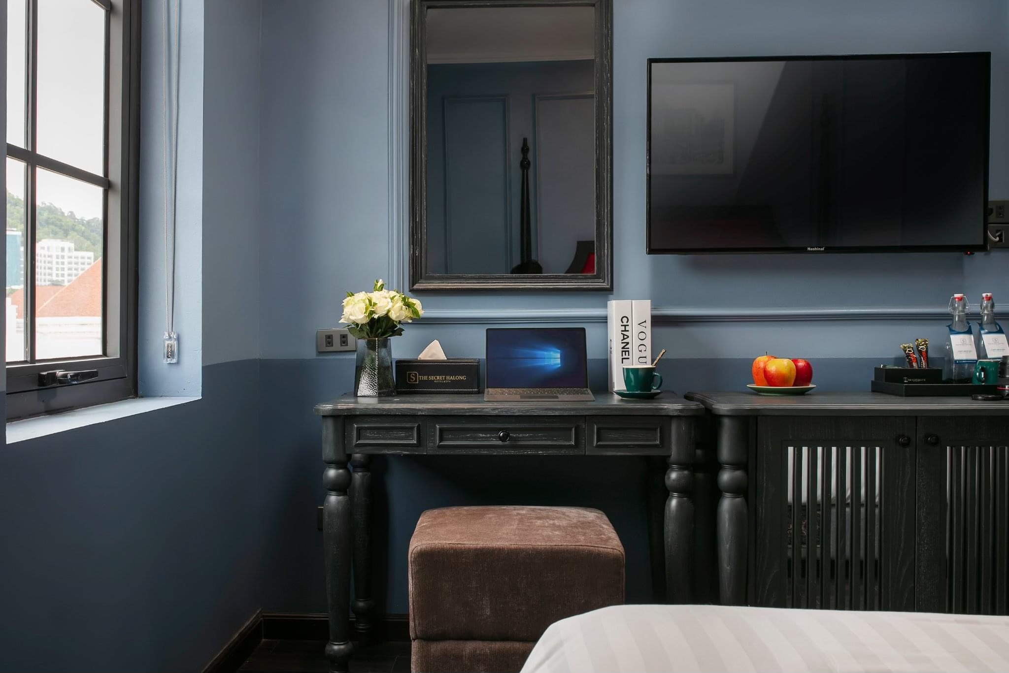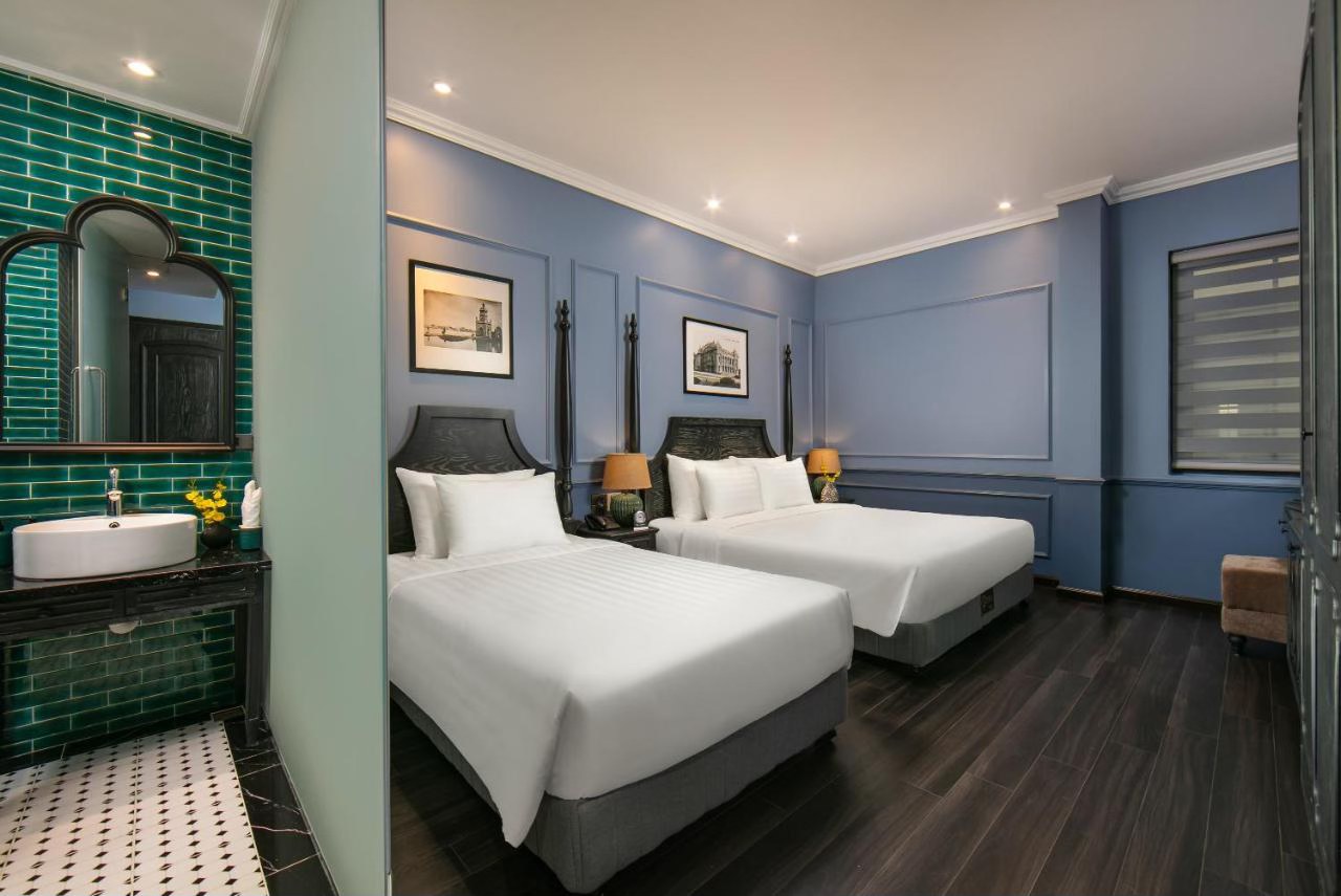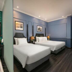 Mô tả Giải pháp nội thất Indochine với tông màu xanh xám chủ đạo, tối đa hóa công năng và lợi nhuận qua các loại phòng đa dạng (Double, Twin, Family).
