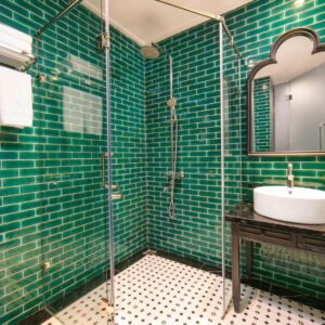 Điểm nhấn Tông màu xanh xám & gỗ đen sậm, giường cột cao, chi tiết mây đan, phào chỉ tường, gạch mosaic xanh.