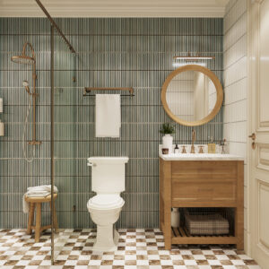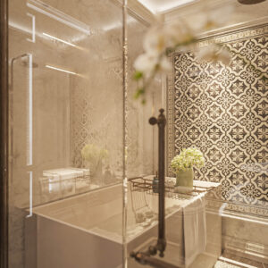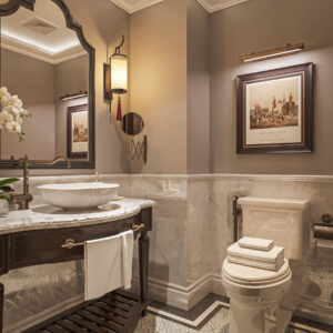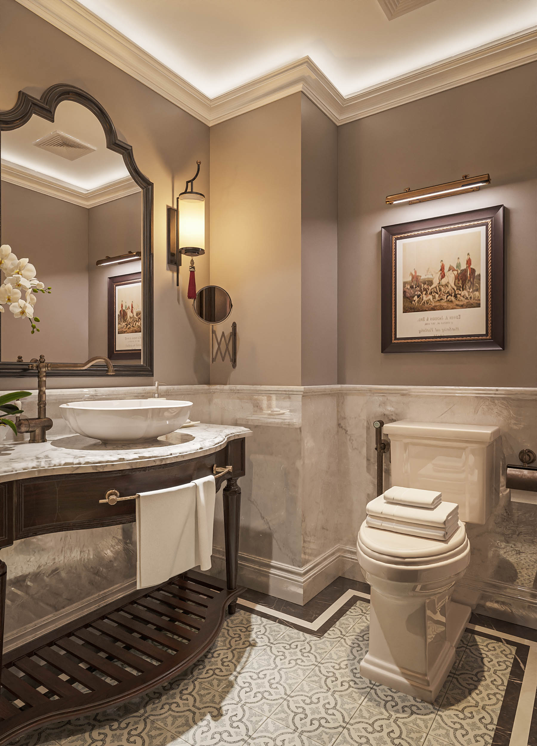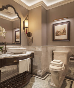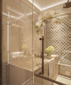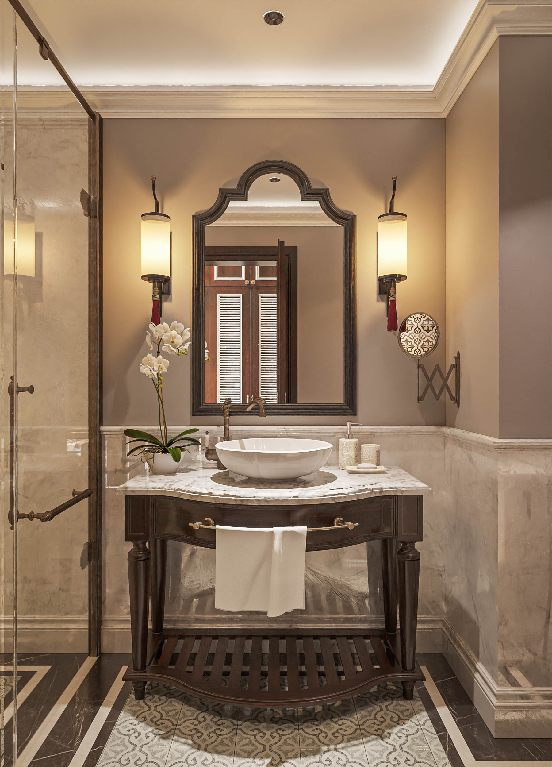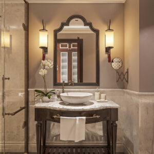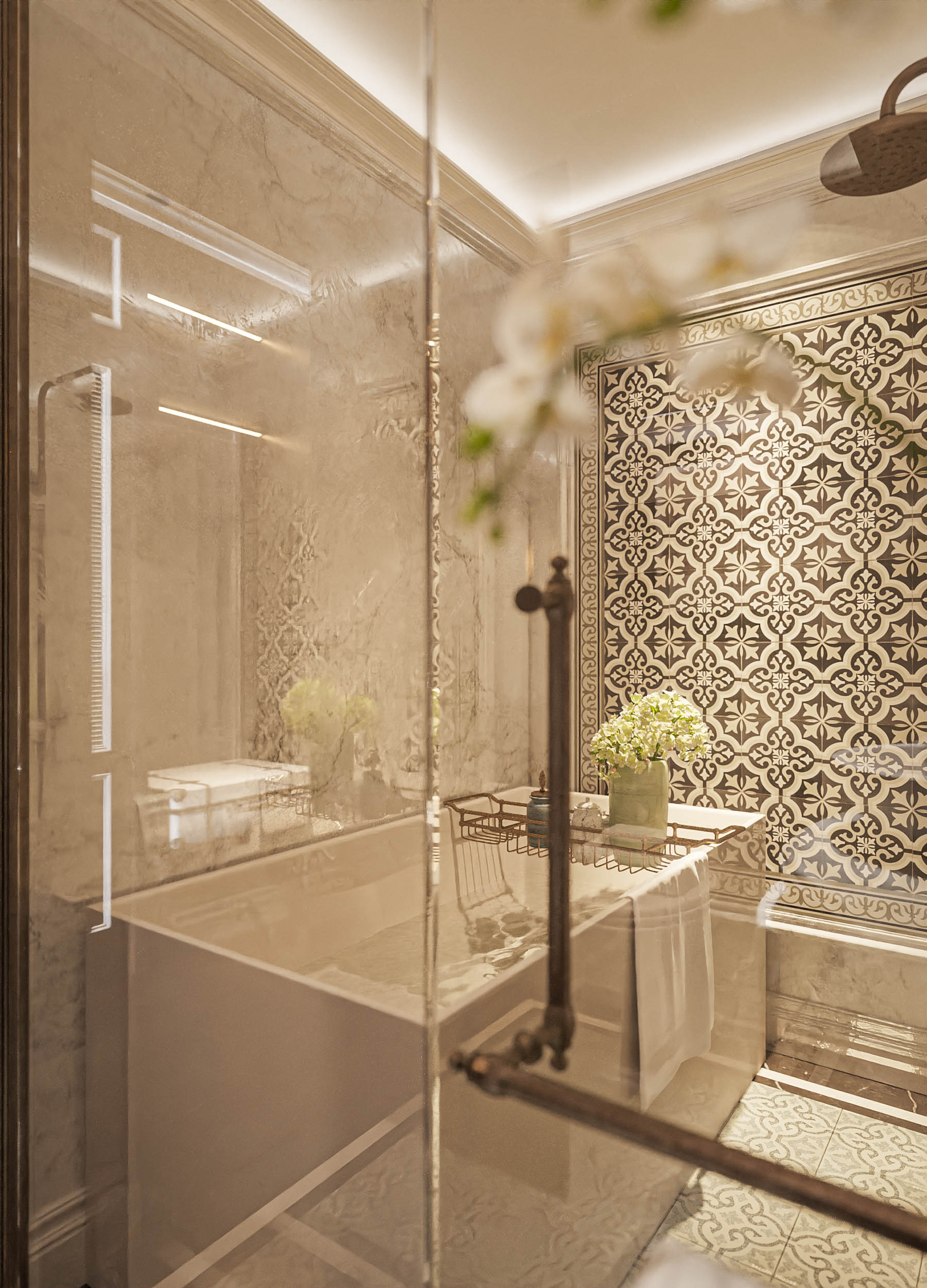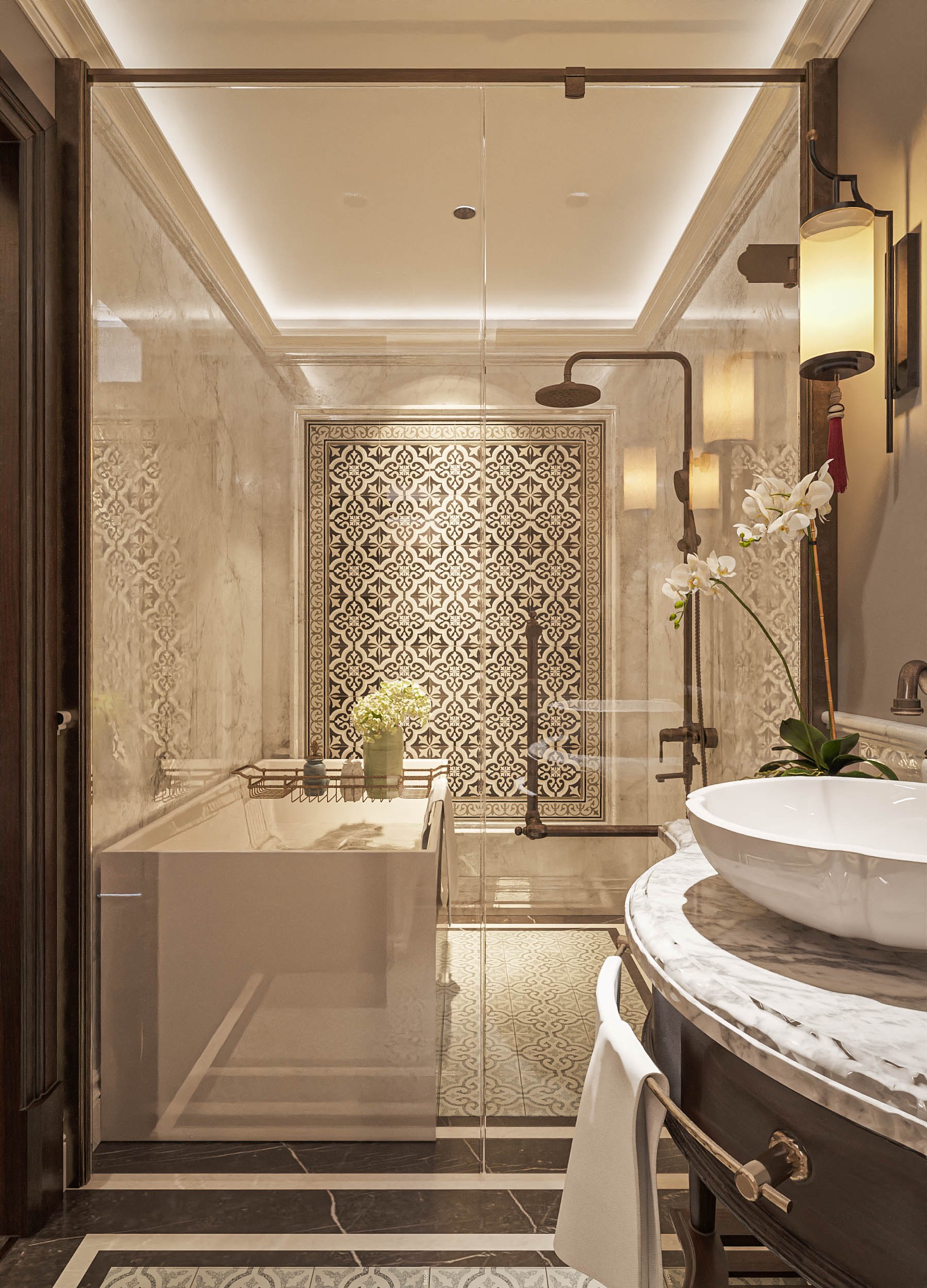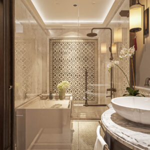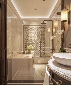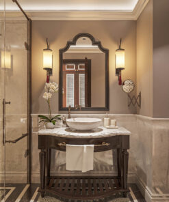 Bên cạnh đó, phòng tắm là một không gian tuyên ngôn về sự sang trọng với đá cẩm thạch ốp lát và phụ kiện vòi sen, vòi lavabo mạ màu. Sự đồng bộ vật liệu này biến trải nghiệm tắm trở thành một dịch vụ cao cấp ngay trong phòng nghỉ.