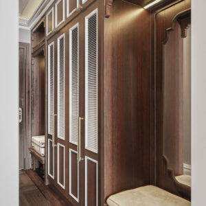 Đặc biệt, sự kết hợp của Đá Cẩm Thạch vân sáng (cho mặt bàn, phòng tắm) và Gỗ Veneer tối màu (cho đầu giường, tủ) tạo nên sự cân bằng vật liệu giữa sự lạnh lùng của đá và sự ấm áp của gỗ, định hình một không gian tinh xảo, thời thượng.