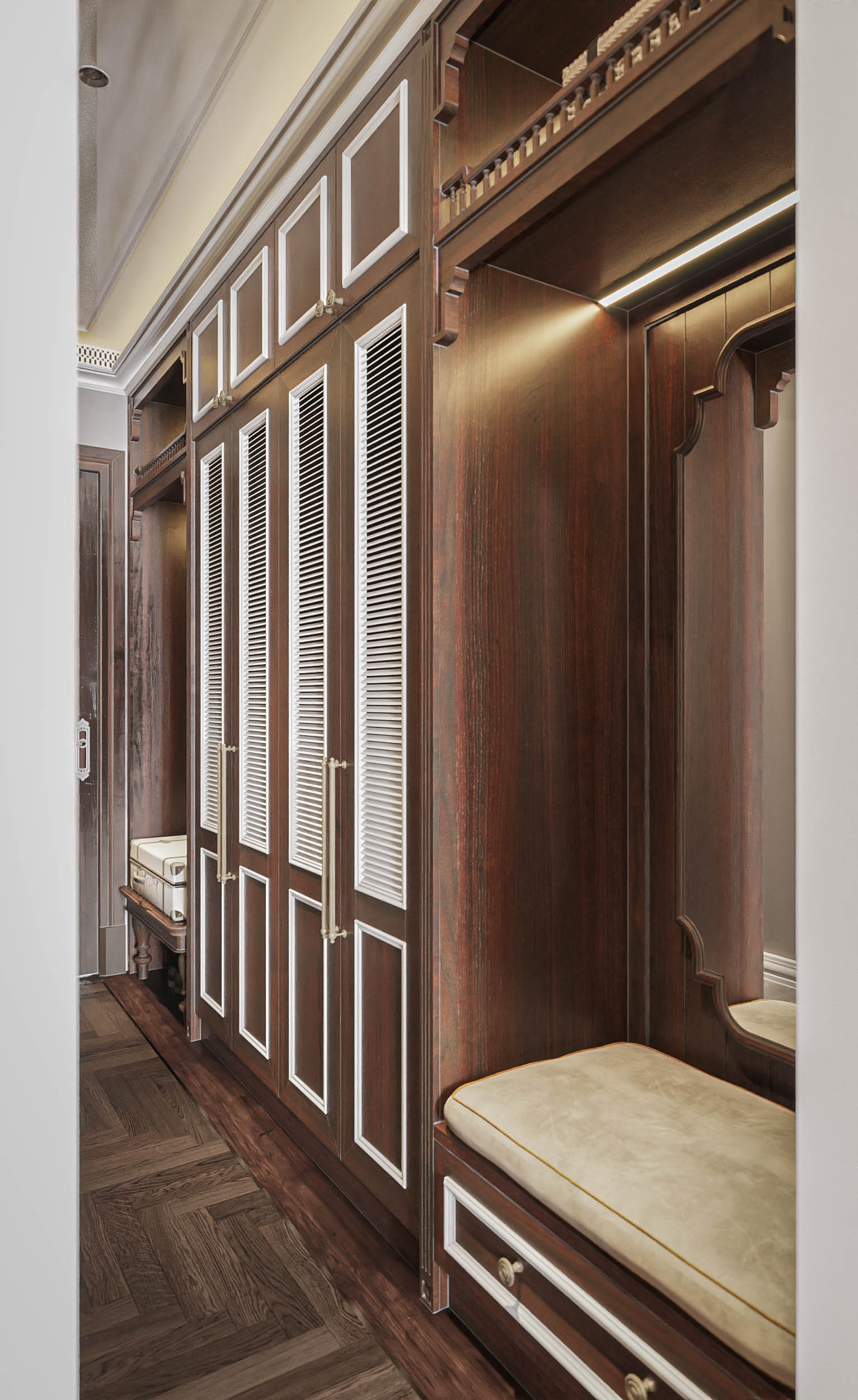 Ý tưởng cốt lõi là tạo ra sự tương phản giữa bề mặt sáng màu (tường, rèm, nệm) và chi tiết tối màu (gỗ, kim loại) để tăng chiều sâu. Kim loại Vàng/Đồng được sử dụng như điểm nhấn xuyên suốt (đèn, chân bàn, khung gương), phản chiếu ánh sáng dịu nhẹ, mang lại cảm giác vương giả.