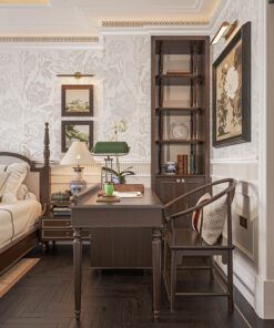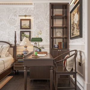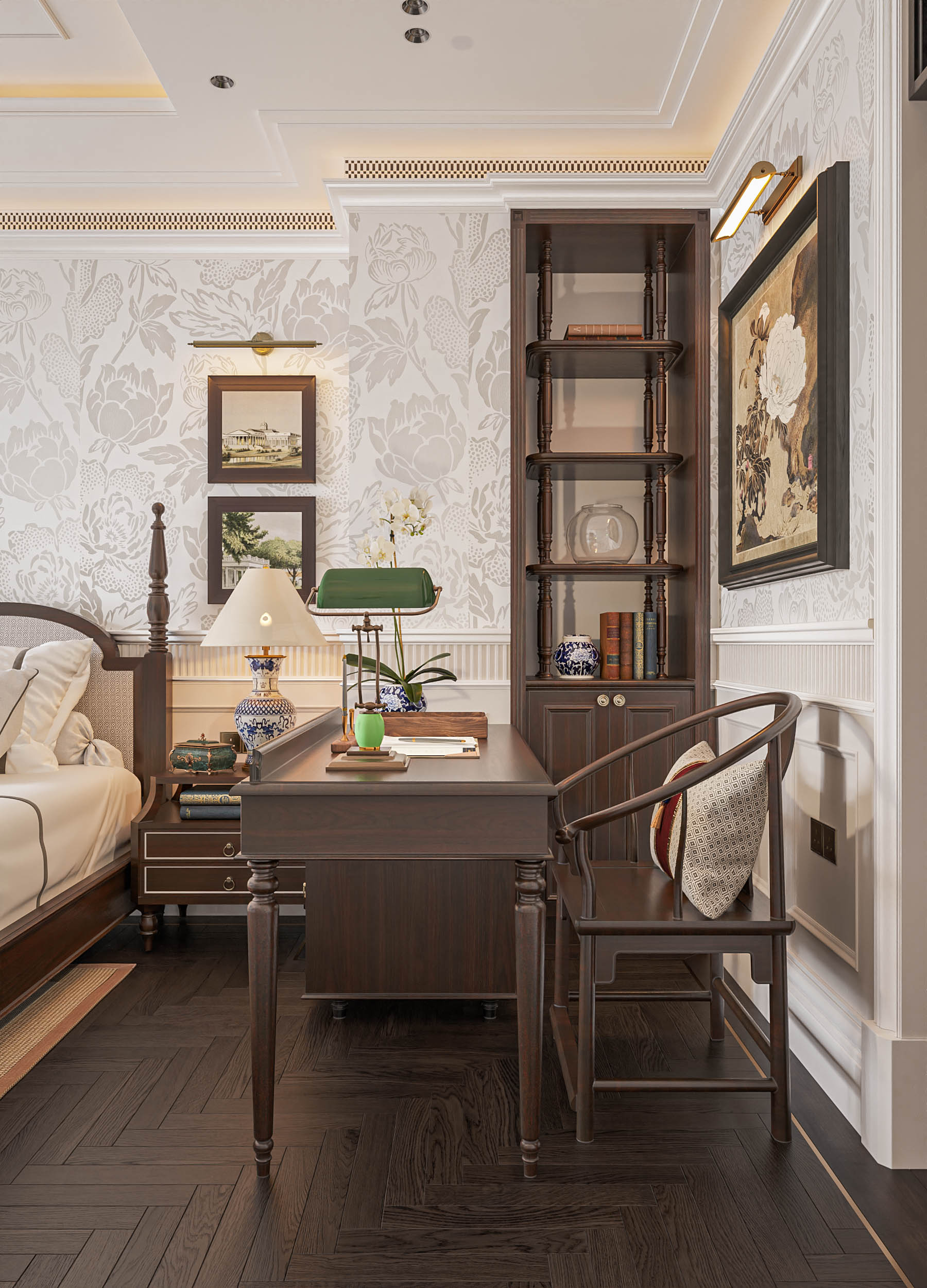 Phòng ngủ được bố trí với giường lớn, đầu giường ốp gỗ tối màu hoặc panel bọc nệm, nhấn bằng đèn treo/đèn bàn kim loại ánh kim đối xứng hai bên. Khu vực bàn trang điểm/làm việc sử dụng mặt đá cẩm thạch và gương tròn/hình học viền kim loại.