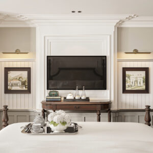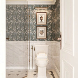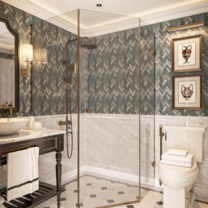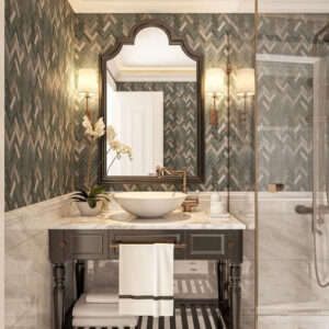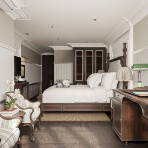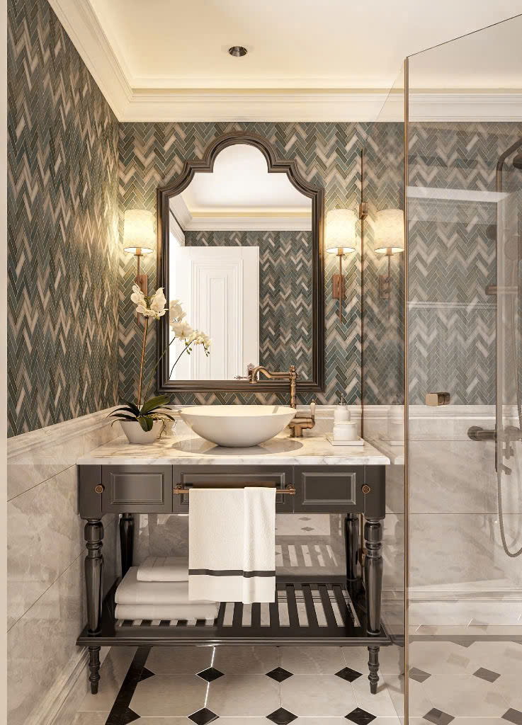 Bên cạnh đó, khu vực bàn trang điểm/tủ được thiết kế bằng gỗ sẫm màu với đường nét cổ điển. Phòng tắm là điểm nhấn không thể thiếu, sử dụng gạch bông hoạ tiết hoặc gạch thẻ xanh ốp tường/sàn, kết hợp gương tròn/bo viền gỗ, biến nơi đây thành góc thư giãn Instagrammable.