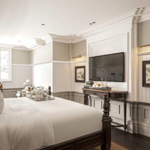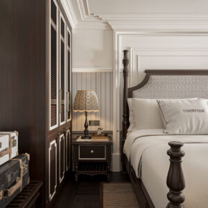 Thiết kế combo nội thất khách sạn boutique Mã Innbt15 là giải pháp nội thất Tropical Indochine (Đông Dương Nhiệt đới), một tổng thể hài hòa giữa nét hoài cổ đậm chất resort và sắc xanh tươi mới của thiên nhiên. Combo này sử dụng gam màu Trắng Kem/Be làm nền, tạo điểm nhấn nghệ thuật bằng tông Xanh Lá Cây/Xanh Rêu ở gạch ốp, kết hợp với nội thất Gỗ Sẫm màu và các chi tiết Mây Tre đan thủ công, kiến tạo nên một không gian giàu cảm xúc, thư thái và mang đậm tinh hoa văn hóa Á Đông.