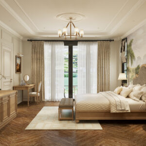 Bên cạnh đó, khu vực bàn trang điểm/tủ được thiết kế bằng gỗ sẫm màu với đường nét cổ điển. Phòng tắm là điểm nhấn không thể thiếu, sử dụng gạch bông hoạ tiết hoặc gạch thẻ xanh ốp tường/sàn, kết hợp gương tròn/bo viền gỗ, biến nơi đây thành góc thư giãn Instagrammable.