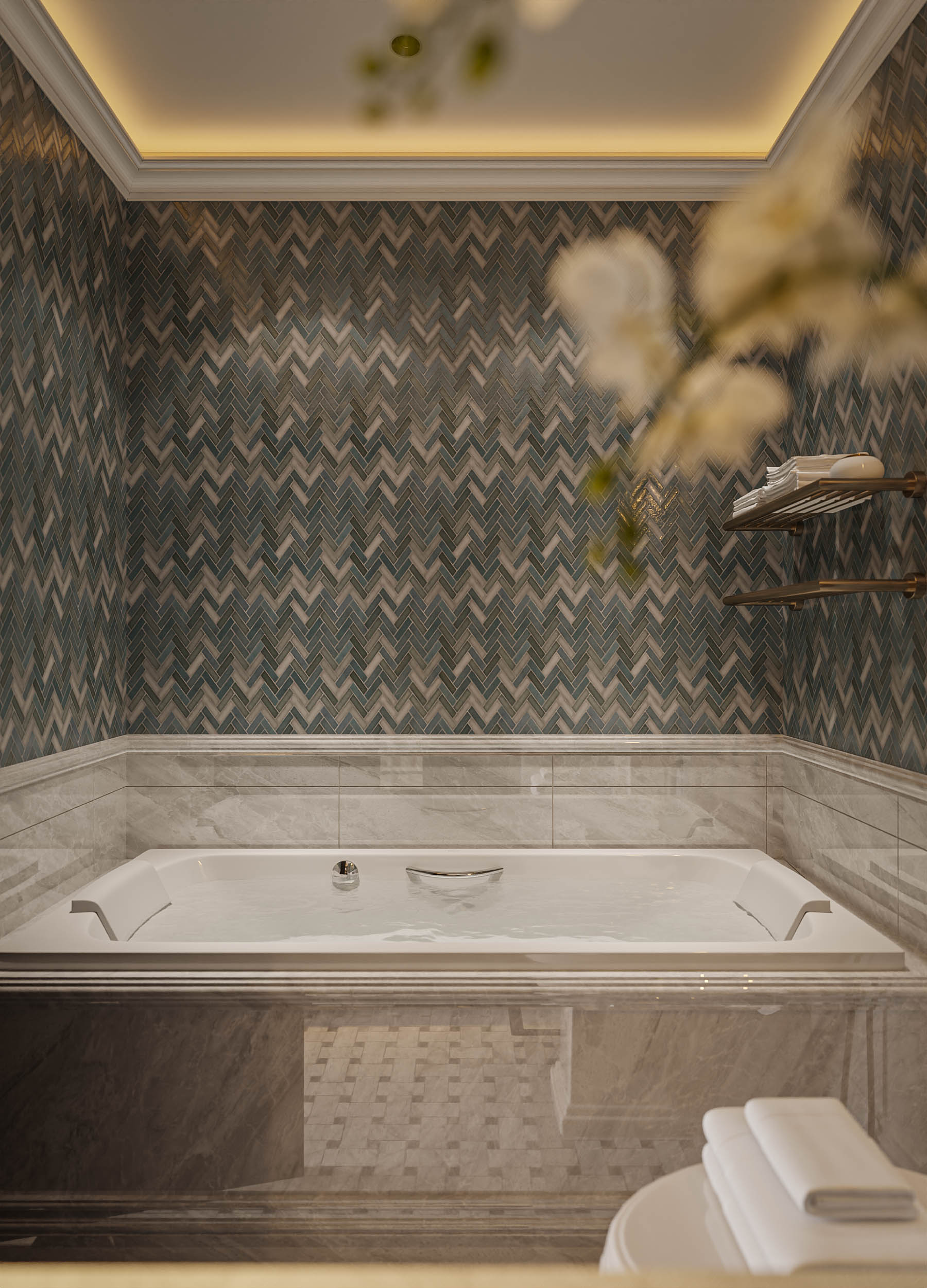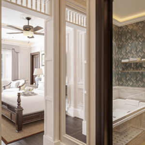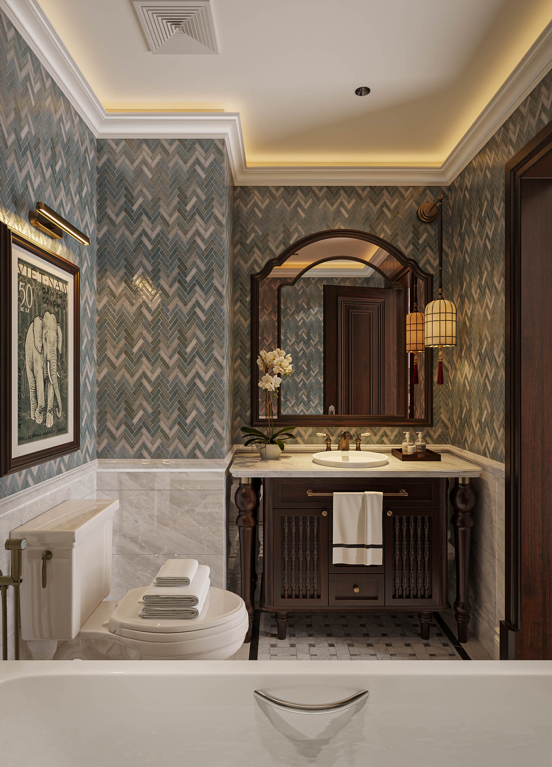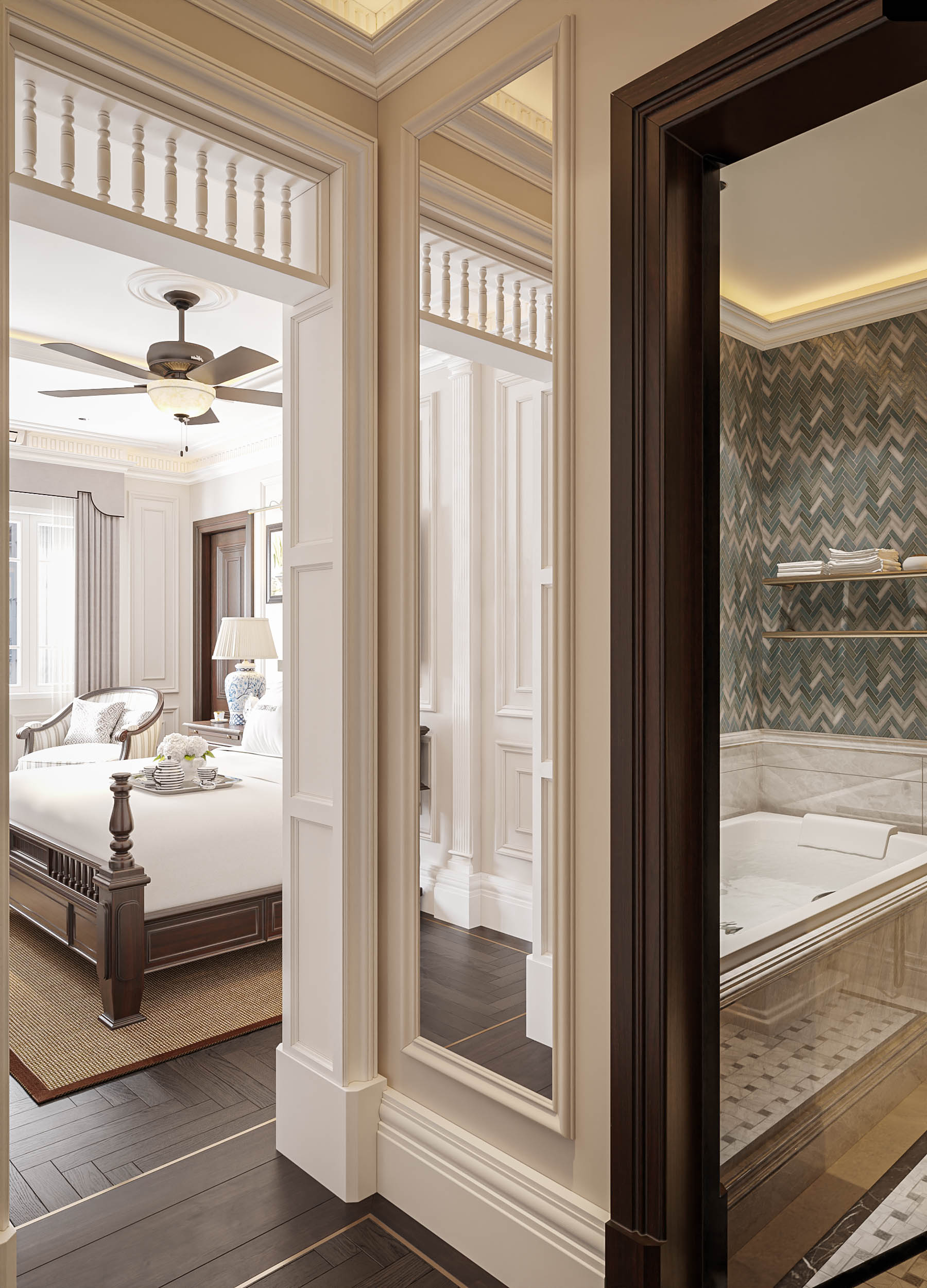 Đặc biệt, phòng tắm được đầu tư vật liệu xứng tầm: Đá Marble/Granite cho bồn rửa, gương lớn viền kim loại và thiết bị vệ sinh cao cấp. Bố cục này không chỉ đẹp mà còn tối ưu công năng trải nghiệm, đáp ứng yêu cầu nghỉ dưỡng cao nhất của khách hàng mục tiêu.