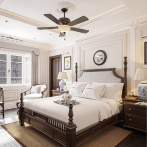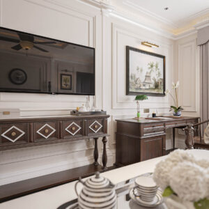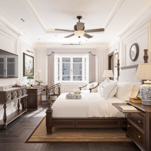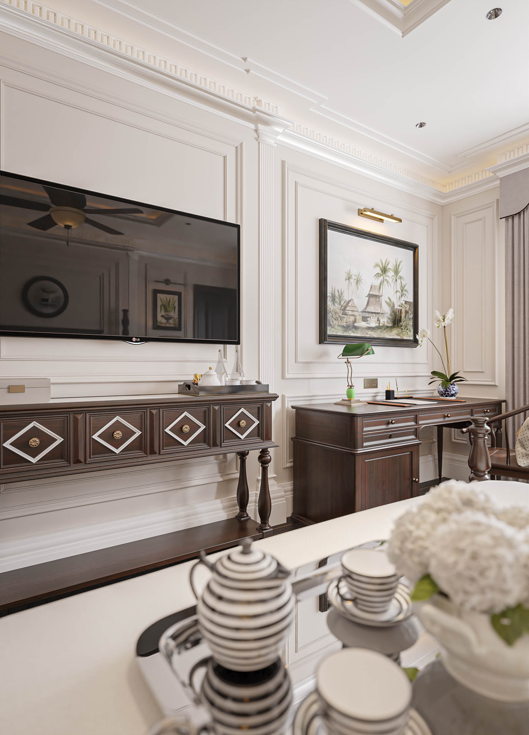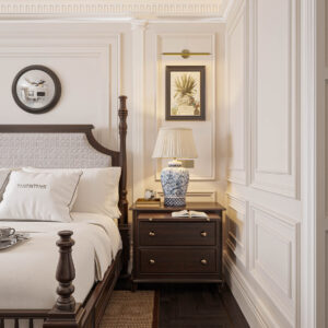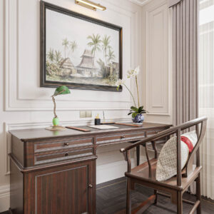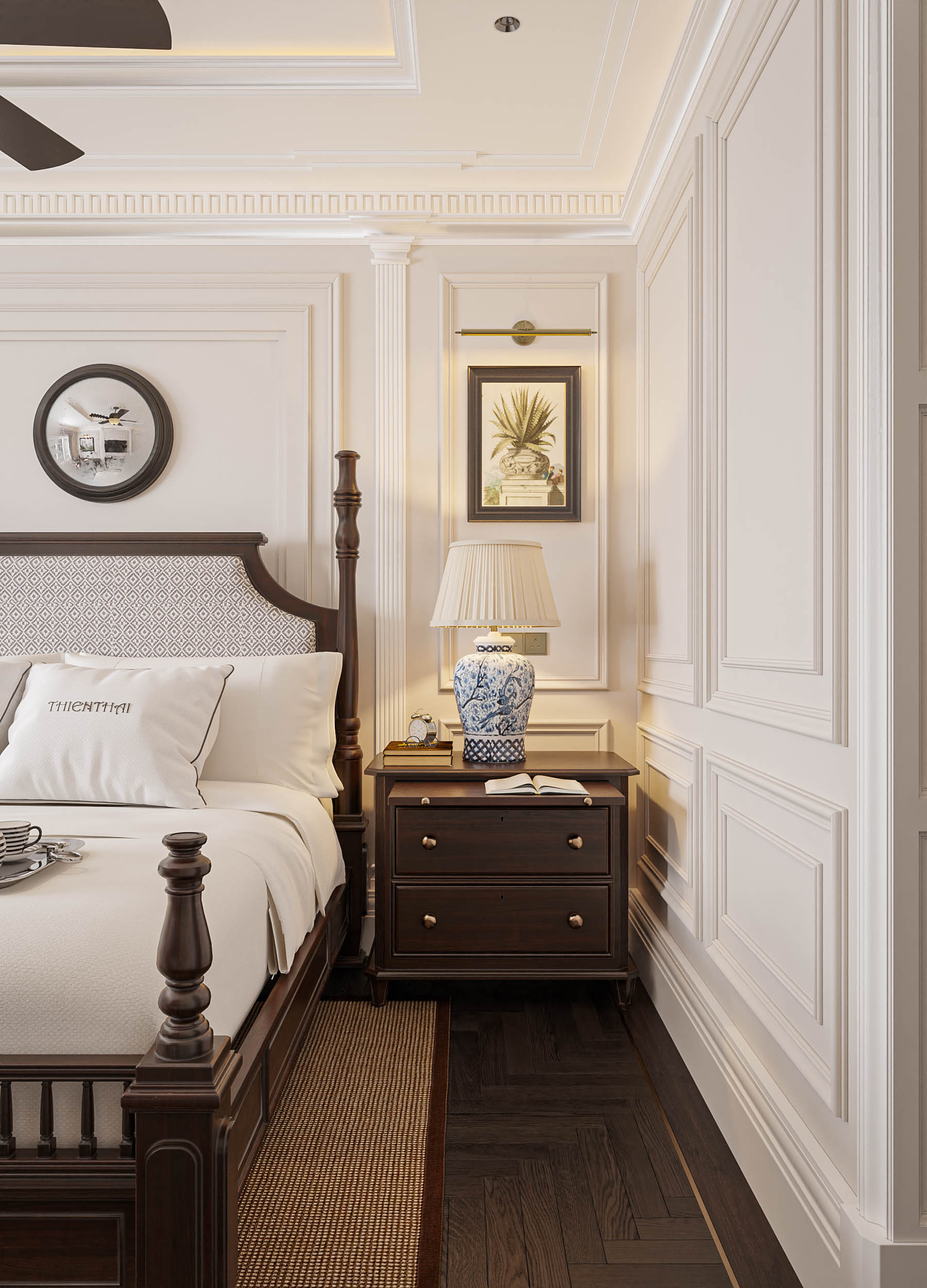 Phòng ngủ nổi bật với nội thất gỗ cao cấp, tích hợp công tắc, ổ cắm thông minh ngay đầu giường. Khu vực bàn làm việc/bàn trang điểm được thiết kế thanh lịch, sử dụng mặt Đá Marble hoặc Kính cường lực màu để tăng tính sang trọng và dễ vệ sinh.