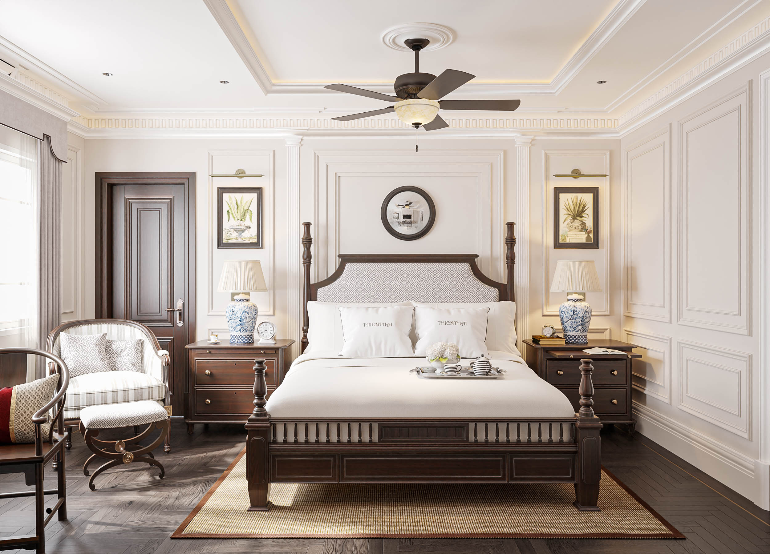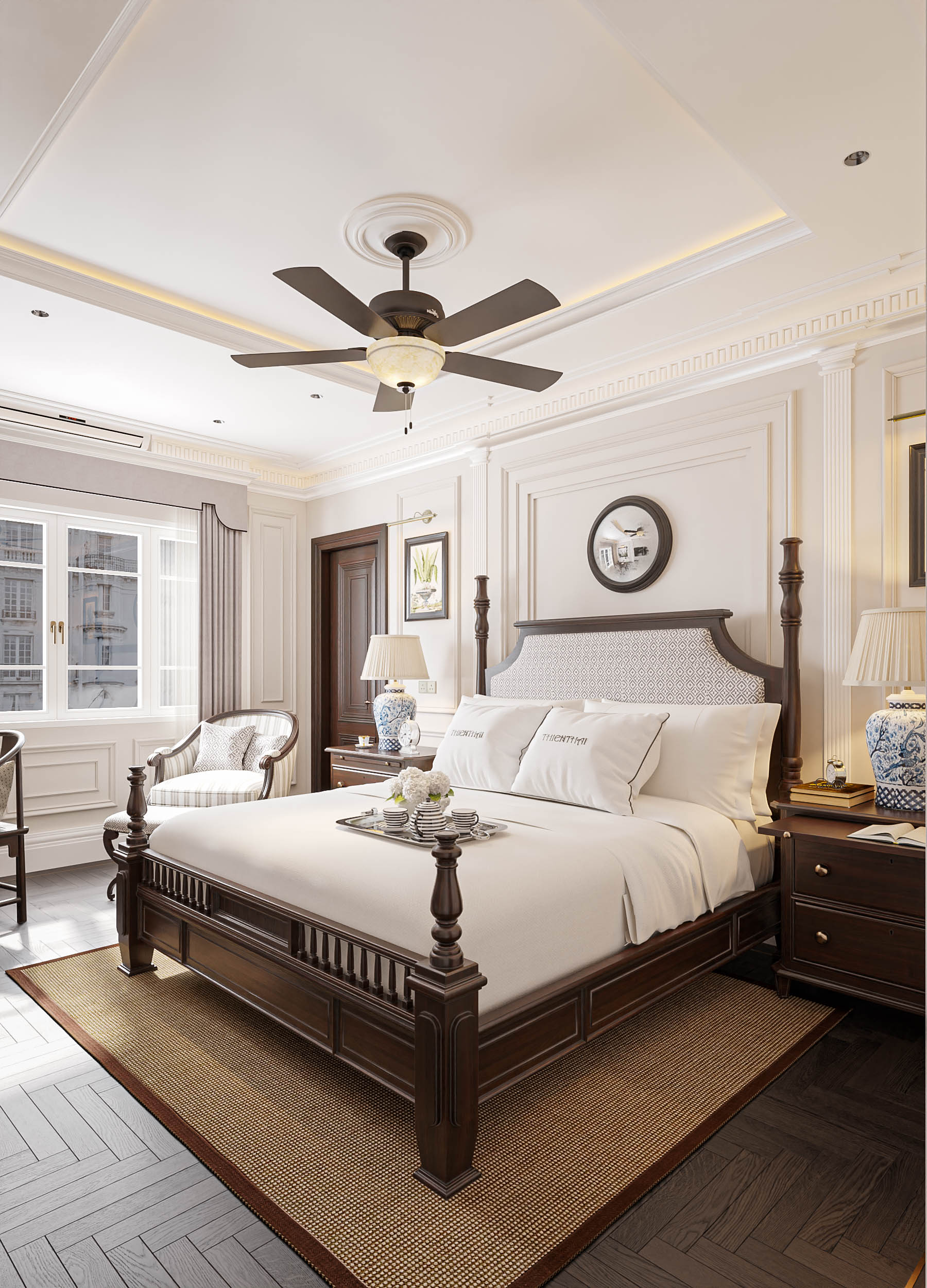 Ý tưởng cốt lõi là tạo ra sự cân bằng hoàn hảo giữa các mảng tường lớn màu sáng (Trắng/Kem) và nội thất màu đậm (Đen/Xám/Gỗ Sẫm). Vách ốp đầu giường là trung tâm nghệ thuật, thường sử dụng gỗ ốp vân đối xứng hoặc kết hợp Đá Marble và Kim loại Ánh kim để tạo hiệu ứng thị giác mạnh.