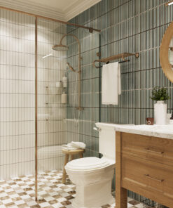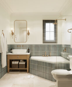 Đặc biệt, khu vực vệ sinh duy trì tông màu sáng với gạch ốp trơn, hiện đại và vách kính phân chia rõ ràng khu vực khô/ướt. Việc bố trí gương lớn không viền giúp nhân đôi không gian, tạo cảm giác sạch sẽ, sang trọng mà vẫn rất thực dụng.