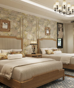 Bên cạnh đó, các chi tiết trang trí như tranh tường mang tính nghệ thuật và rèm cửa vải thô tạo nên sự mềm mại và chiều sâu thị giác. Phong cách này đặc biệt thu hút khách hàng yêu thích sự hoài niệm tinh tế và chất lượng trải nghiệm cao cấp.