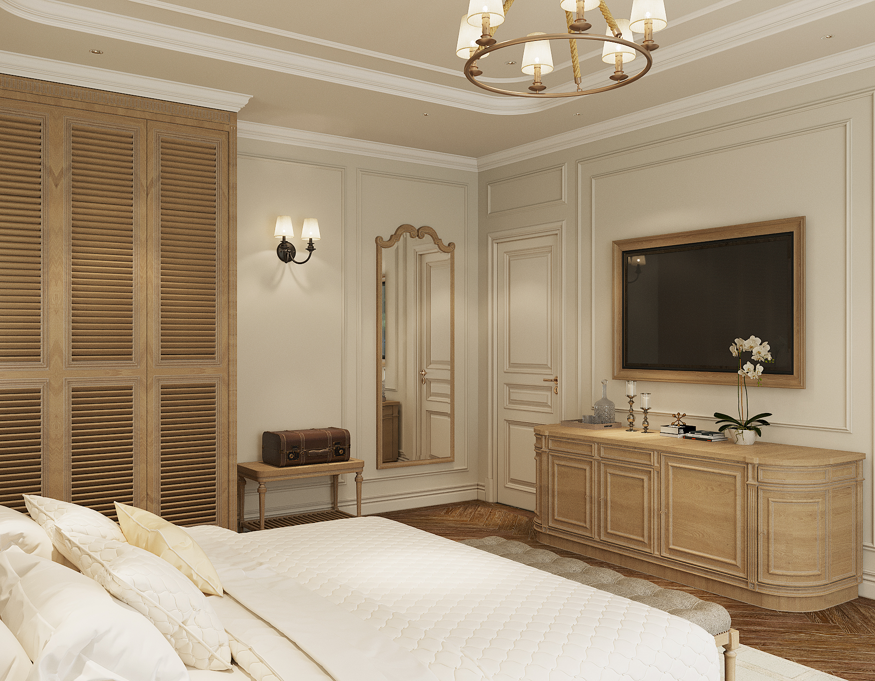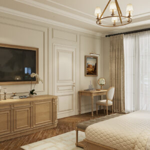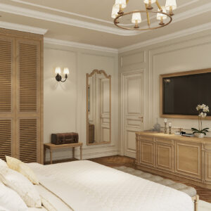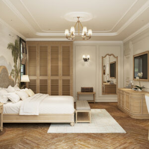 Phòng ngủ được thiết kế lấy giường ngủ làm trung tâm trải nghiệm, với các hệ tủ kệ âm tường tinh gọn, tích hợp bàn làm việc/trang điểm. Không gian được mở rộng tối đa bằng cách sử dụng kính và vách ngăn thông minh (nếu có), đồng thời đảm bảo sự riêng tư tuyệt đối khi cần thiết.