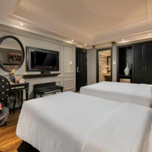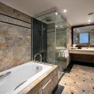 Đặc biệt, hệ tủ quần áo và kệ hành lý được thiết kế âm tường/cánh phẳng để giữ cho không gian gọn gàng, liền mạch. Phòng vệ sinh sử dụng kính ngăn cách (có rèm che) và đá marble nhân tạo với thiết bị cao cấp để nâng tầm trải nghiệm lưu trú.